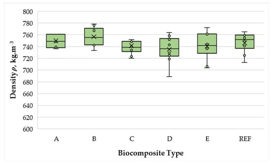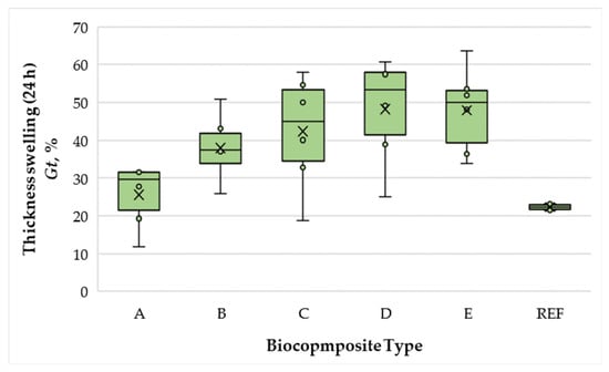 All biocomposites exhibited densities of 735–756 kg·m−3 (variation ±2.8%), indicating that the applied press regime was effective in achieving the target density. The narrow variation indicates that differences in physical and mechanical performance can be attributed primarily to formulation and processing parameters rather than density deviations (Figure 2).