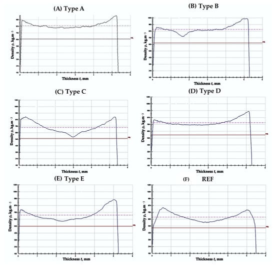 Density profile of biocomposite panels with varying proportions of wood fibers, coffee grounds, and ammonium lignosulfonate: (A) 40%—total content of SCG and ALS at 40% relative to the absolutely dry fibers; (B) 50%—total content of SCG and ALS at 50% relative to the absolutely dry fibers; (C) 60%—total content of SCG and ALS at 60% relative to the absolutely dry fibers; (D) 70%—total content of SCG and ALS at 70% relative to the absolutely dry fibers; (E) 75%—total content of SCG and ALS at 75% relative to the absolutely dry fibers; (F)—reference panel with a 10% content of UF resin relative to the absolutely dry fibers.