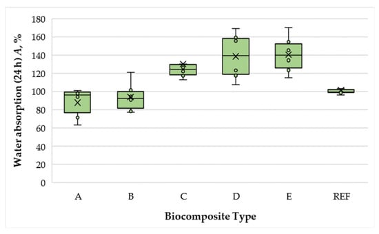 Water absorption (WA) results of the laboratory-fabricated biocomposite panels are presented in Figure 4.