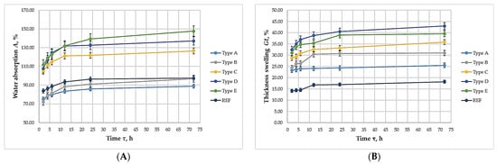 Water absorption of biocomposite panels with varying proportions of wood fibers, spent coffee grounds, and ammonium lignosulfonate. A–E correspond to panels bonded with increasing binder content (40, 50, 60, 67, and 75 wt% SCG + ALS relative to oven-dry fibers, respectively). REF denotes the reference panel bonded with 10 wt% urea–formaldehyde (UF) resin.