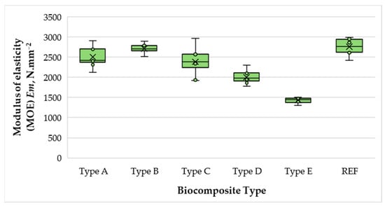 Figure 7 presents the variation in the modulus of elasticity (MOE) of the biocomposite materials depending on wood fibers, SCGs, and ALS content.