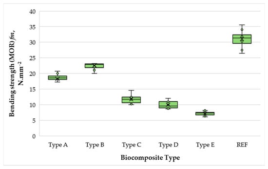 Bending strength (MOR) of biocomposite panels with varying proportions of wood fibers, spent coffee grounds, and ammonium lignosulfonate. A–E correspond to panels bonded with increasing binder content (40, 50, 60, 67, and 75 wt% SCG + ALS relative to oven-dry fibers, respectively). REF denotes the reference panel bonded with 10 wt% urea–formaldehyde (UF) resin.