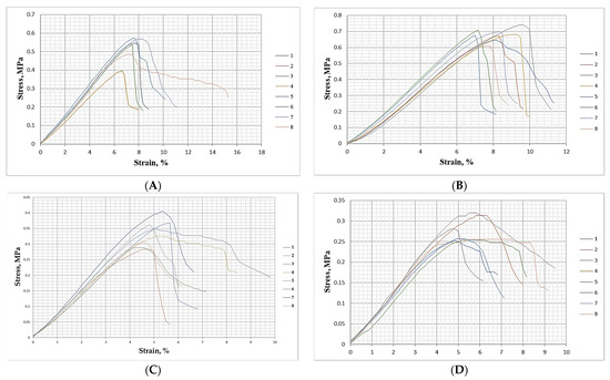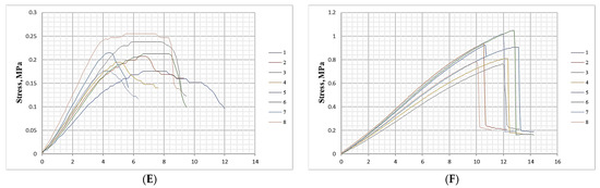Deformation behavior at bending of biocomposite materials with different inclusions of wood fibers, spent coffee grounds and ammonium lignosulfonate: (A) 40%—total content of SCG and ALS at 40% relative to the absolutely dry fibers; (B) 50%—total content of SCG and ALS at 50% relative to the absolutely dry fibers; (C) 60%—total content of SCG and ALS at 60% relative to the absolutely dry fibers; (D) 70%—total content of SCG and ALS at 70% relative to the absolutely dry fibers; (E) 75%—total content of SCG and ALS at 75% relative to the absolutely dry fibers; (F)—reference panel with a 10% content of UF resin relative to the absolutely dry fibers.
