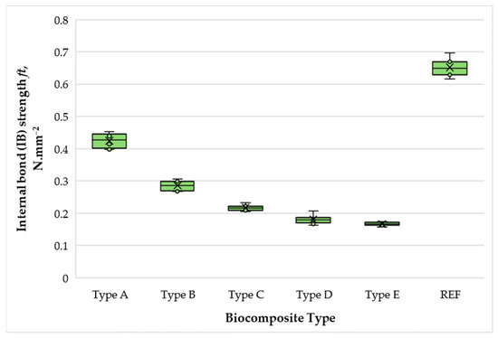 Internal bond (IB) strength of biocomposite panels with varying proportions of wood fibers, spent coffee grounds, and ammonium lignosulfonate. A–E correspond to panels bonded with increasing binder content (40, 50, 60, 67, and 75 wt% SCG + ALS relative to oven-dry fibers, respectively). REF denotes the reference panel bonded with 10 wt% urea–formaldehyde (UF) resin.