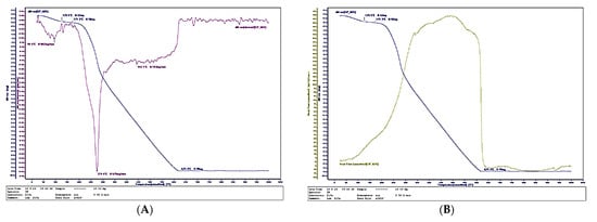 Thermal behavior of a biocomposite with 60% total content of SCG and ALS: (А) Thermogravimetry; (B) Differential scanning calorimetry.