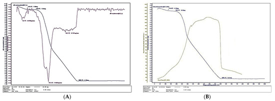 The TGA/DTG curves clearly confirm the organic (bio-based) nature of the fabricated composites containing wood fibers, SCG and ALS. The amount of inorganic residue decreased with increasing binder content: 8.46% for the 40% SCG–ALS composite, 4.45% for the 50% composite, and only 2.88% for the 60% composite. In contrast, the UF-bonded control panels yielded a significantly higher inorganic residue of 11.57%. The inorganic inclusions in the SCG–ALS composites can be attributed primarily to the mineral constituents naturally present in the wood fibers [66,67].