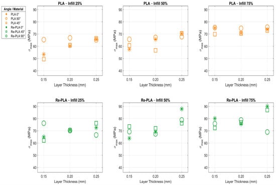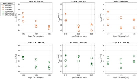 The irregular trends seen in the St-PLA and St-Re-PLA specimens in Figure 4 are due to the fact that the sterilisation and recycling processes disrupt the polymer chain structure, weakening interlayer bonding, increasing internal stresses, and making the microstructure heterogeneous. For this reason, even if the infill rate increased, the strength did not always increase, and in some cases, on the contrary, decreases were observed. In addition, critical threshold values occurred at certain layer thicknesses, minimising interface adhesion and causing fluctuations in mechanical performance; it has been reported in the literature that such processes can cause unpredictable strength losses in biopolymers [].