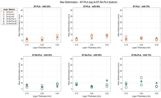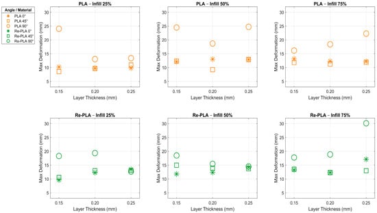 - In PLA specimens, the infill rate, layer thickness, and printing orientation had uniform and significant effects on deformation, while these effects were more limited in Re-PLA. In St-PLA and St-Re-PLA specimens, the results were more variable, with the effects of layer thickness and printing orientation becoming irregular. In general, sterilization and recycling processes make the deformation behavior of materials more unpredictable, while the most regular and high deformation was obtained in PLA specimens.