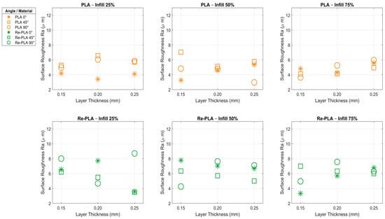 The layer thickness parameter showed different effects depending on the specimen type. As the layer thickness increased, the surface roughness generally increased first and then started to decrease after a certain value. This can be explained as the smoothing of the surface at low thicknesses due to more precise and smoother transitions between layers, the increase in roughness at medium thicknesses as the transitions become more pronounced, and the decrease in surface fluctuations at high thicknesses as the layer alignment becomes harmonious again. Especially in St-Re-PLA specimens, an increase of 15.5% by increasing the layer thickness from 0.15 mm to 0.20 mm and a decrease of 14.5% by increasing the layer thickness from 0.20 mm to 0.25 mm provided a clear example of this trend [].
