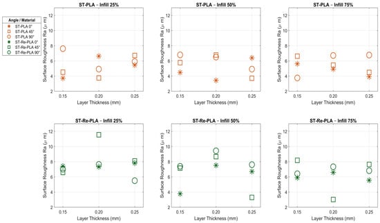 In conclusion, although the modeling of Ra values was not as successful as that of mechanical strength, regression models yielded statistically reliable results, especially for certain groups such as the St-PLA variant. These findings demonstrate the influence of production parameters on surface quality and, in agreement with the literature, show that surface behavior can be quite variable [].