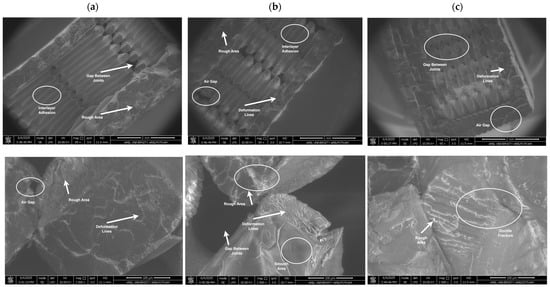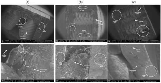 SEM images of PLA specimens with (a) 25%, (b) 50%, and (c) 75% infill rate.