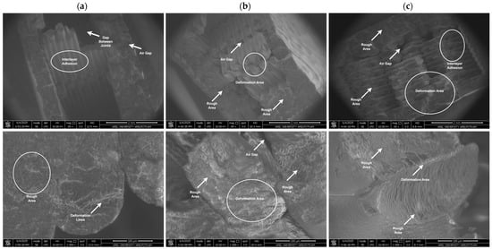 This behavior indicates that thinner layers tend to make the structure more brittle, whereas thicker layers enhance the material’s capacity to deform, even though the interlayer adhesion may become weaker due to reduced bonding between layers. In contrast, Re-PLA specimens exhibited much smaller changes, suggesting that they maintain a more stable structural response to changes in layer thickness. This could be related to altered molecular structure or stress relaxation effects introduced during the recycling process. For St-PLA and St-Re-PLA specimens, the deformation did not follow a regular pattern with increasing layer thickness. Particularly in St-PLA, deformation increased by 13.10% and 9.45% across the same thickness intervals, but these increases were inconsistent. This fluctuation is likely due to the weakening of interlayer bonding caused by the sterilization process, which may have degraded the surface properties of the layers or introduced microdefects. On the other hand, St-Re-PLA specimens showed a more consistent and limited change, indicating that the combined effects of sterilization and recycling resulted in a structure less sensitive to layer thickness variations.