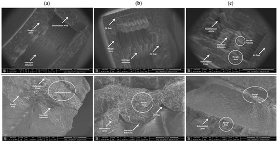 - SEM images showed that as the infill rate increased, the voids in the specimens decreased and the adhesion between filaments improved. While a more brittle fracture behavior was observed in PLA and Re-PLA specimens, plastic deformation traces became more pronounced, and ductile fracture properties became more prominent in St-PLA and St-Re-PLA. These findings are consistent with the surface roughness results and reveal that sterilization and recycling processes significantly affect the fracture morphology of the material.