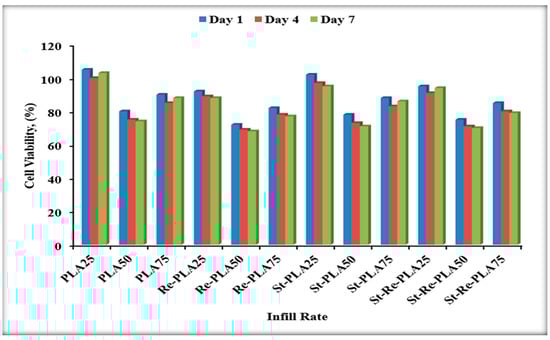 For St-PLA, most groups decreased gradually, but at 75% infill, viability recovered from 88% on day 1, to 83% on day 4, and back up to 86% on day 7. At lower infills (25% and 50%), values continued to decline (e.g., 25% infill: 102% → 97% → 95%). For St-Re-PLA, only the 25% infill condition showed a small recovery (95% → 91% → 94%), while 50% and 75% infills continued to decline (e.g., 50% infill: 75% → 71% → 70%). For Re-PLA, all conditions showed a gradual decline with no significant recovery. For example, at 25% infill, viability decreased from 92% on day 1, to 89% on day 4, and 88% on day 7.