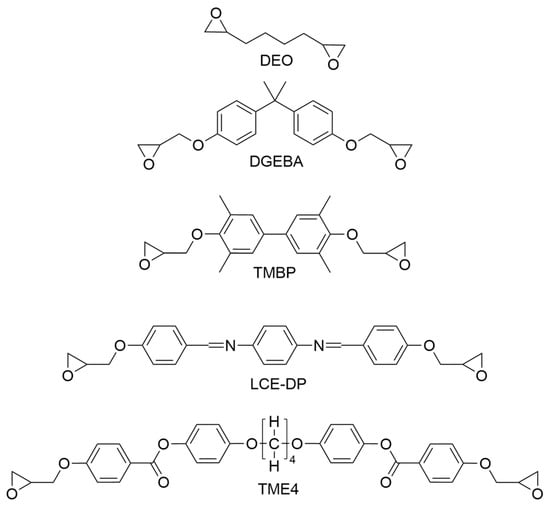 - Shiota, A.; Ober, C.K. Synthesis and curing of novel LC twin epoxy monomers for liquid crystal thermosets. J. Polym. Sci. Part A Polym. Chem. 1996, 34, 1291–1303. [Google Scholar] [CrossRef]