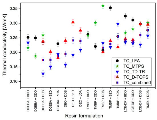 Even for identical formulations, conductivity values can shift significantly depending on the measurement protocol, and only slight increases in TC were observed for more rigid aromatic structures. No clear evidence was found for mesophase formation in the cured epoxies examined when SAXS/WAXS measurements were compared to amorphous epoxies like DGEBA.
