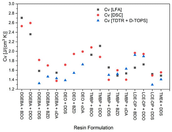 The test specimens were coated on both sides with graphite varnish (Graphit 33 from CRC-KONTAKTCHEMIE Südring 9, 76473 Iffezheim, Germany) to ensure complete absorption of the laser pulse. The coating thickness was not measured; however, care was taken to apply a uniform and sufficiently opaque layer on each specimen. During the measurement, the sample was irradiated with a light pulse on one side, and the temperature increase over time on the other side was determined. The faster the increase in temperature on the other side of the sample, the higher the thermal diffusivity. The corresponding software calculated the thermal diffusivity, from which the TC was derived by multiplying by the density and specific heat of the sample. The measurements of these last two values are described in the corresponding sections of this experimental section. Three samples were made for each resin formulation, and they were measured three times, flipping them upside down after each measurement. The average of all these values was calculated, improving measurement precision and helping to reduce random measurement variability, with overall variation across samples typically within ±0.01 W/(m·K). NETZSCH, Wittelsbacherstraße 42, 95100 Selb, Germany quotes an accuracy of ±3% for the thermal diffusivity. The polyimide Vespel® was used as a standard reference material.
