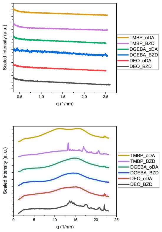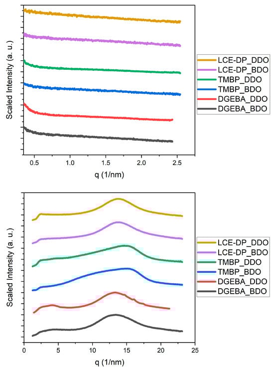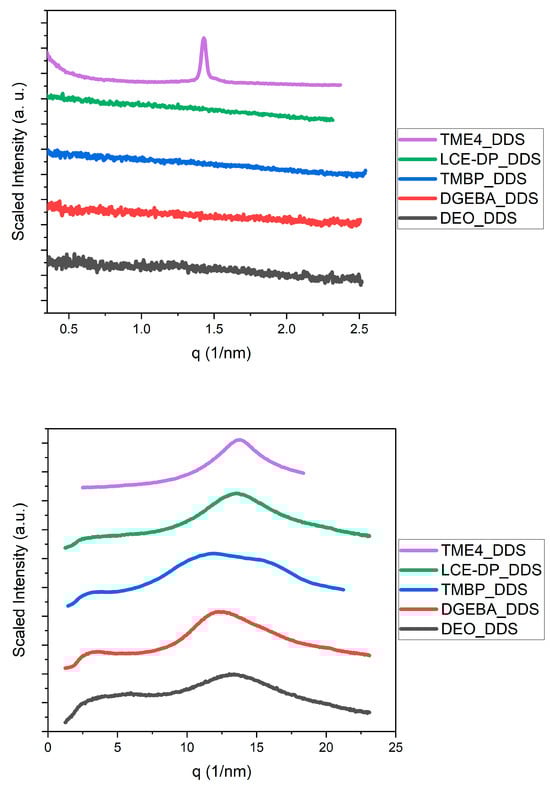 Some publications report not only the presence of liquid crystalline or mesophase structures in their epoxy networks but also semicrystallinity [69,70,71]. A previous report by Lv et al. correlated thermal conductivity to measured crystallinity in epoxy resins [69]. However, a reconsideration of the WAXS data suggests that these results may reflect phase-separated crystallized monomers rather than semicrystalline polymer networks.