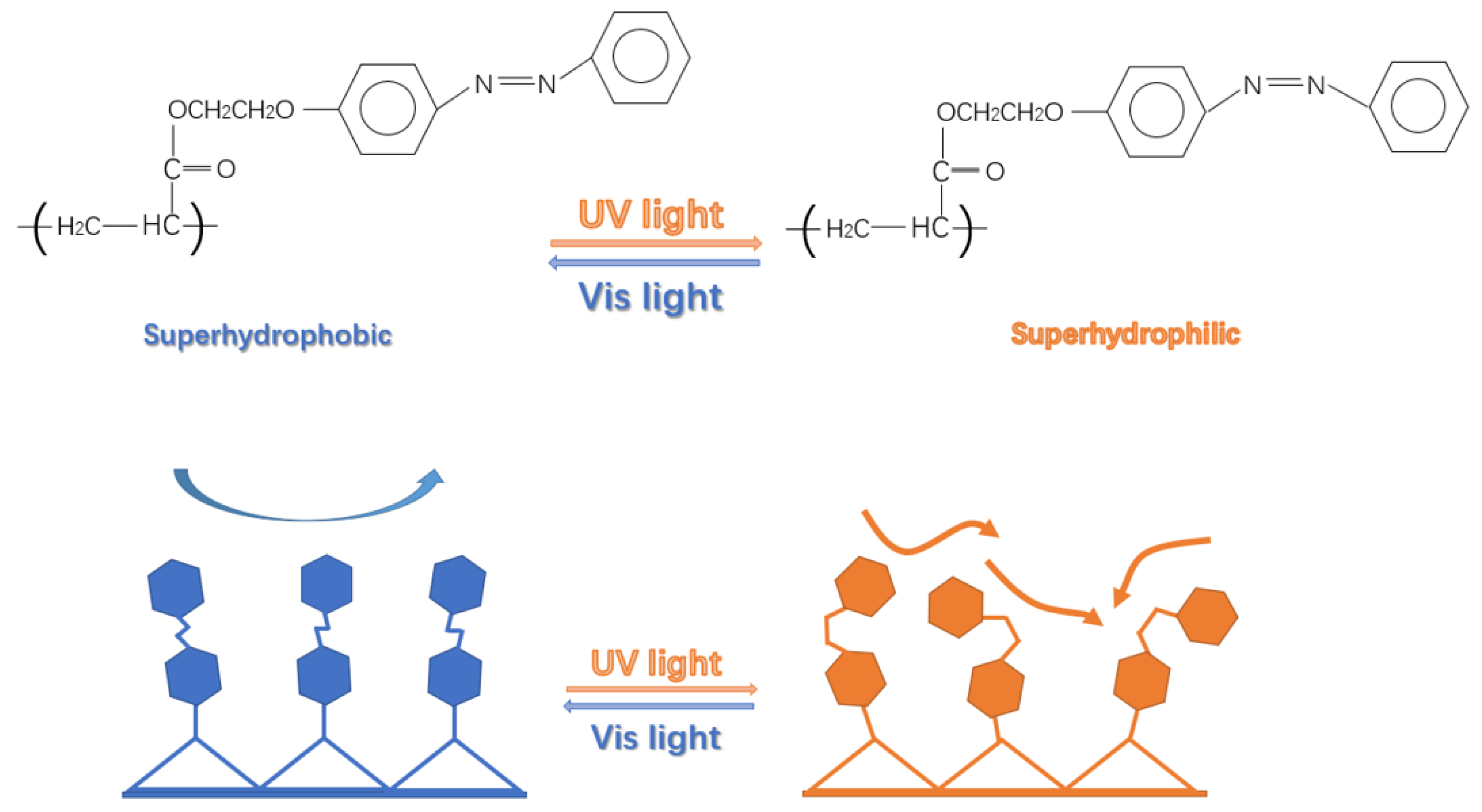- Wang, D.; Xu, L.; Zhang, L.; Zhang, L.; Zhang, A. Hydrophobic/superhydrophobic reversible smart materials via photo/thermo dual-response dynamic wrinkled structure. Chem. Eng. J. 2021, 420, 127679. [Google Scholar] [CrossRef]