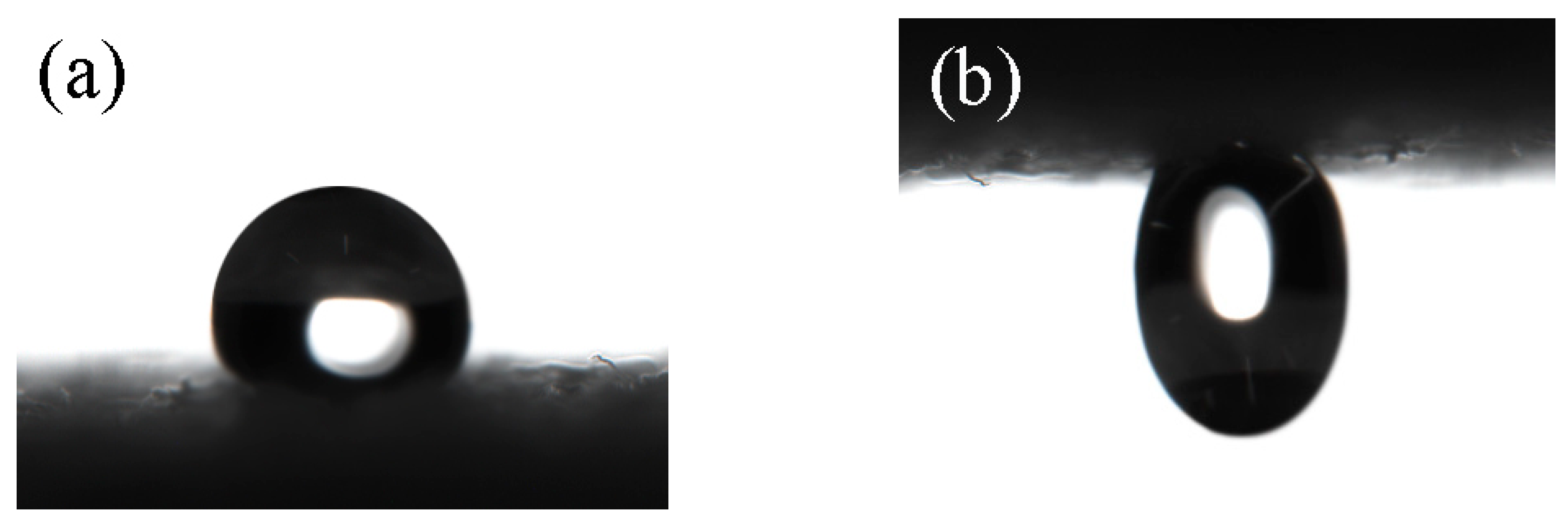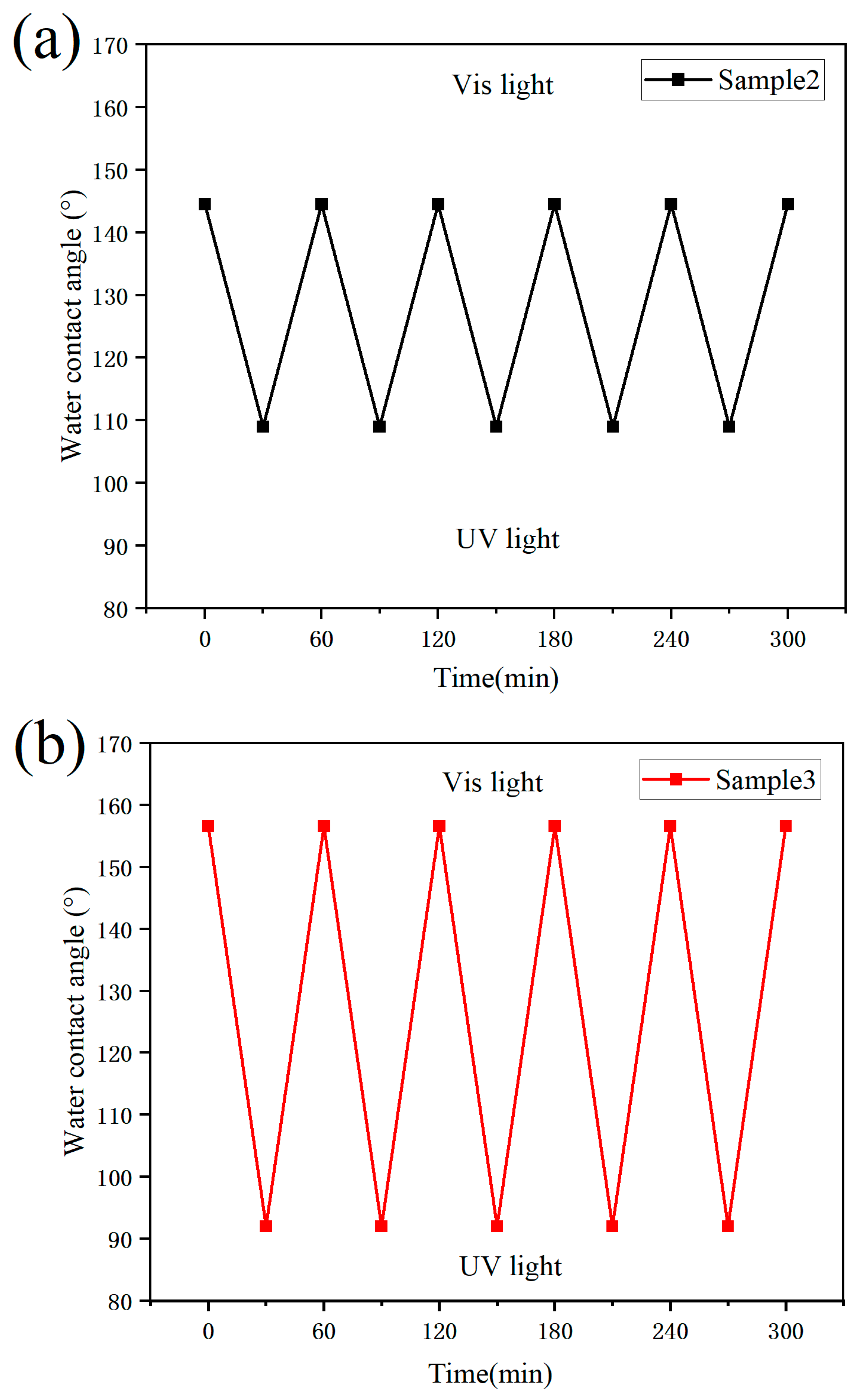 2.5. Preparation of Light-Responsive Superhydrophobic Paper