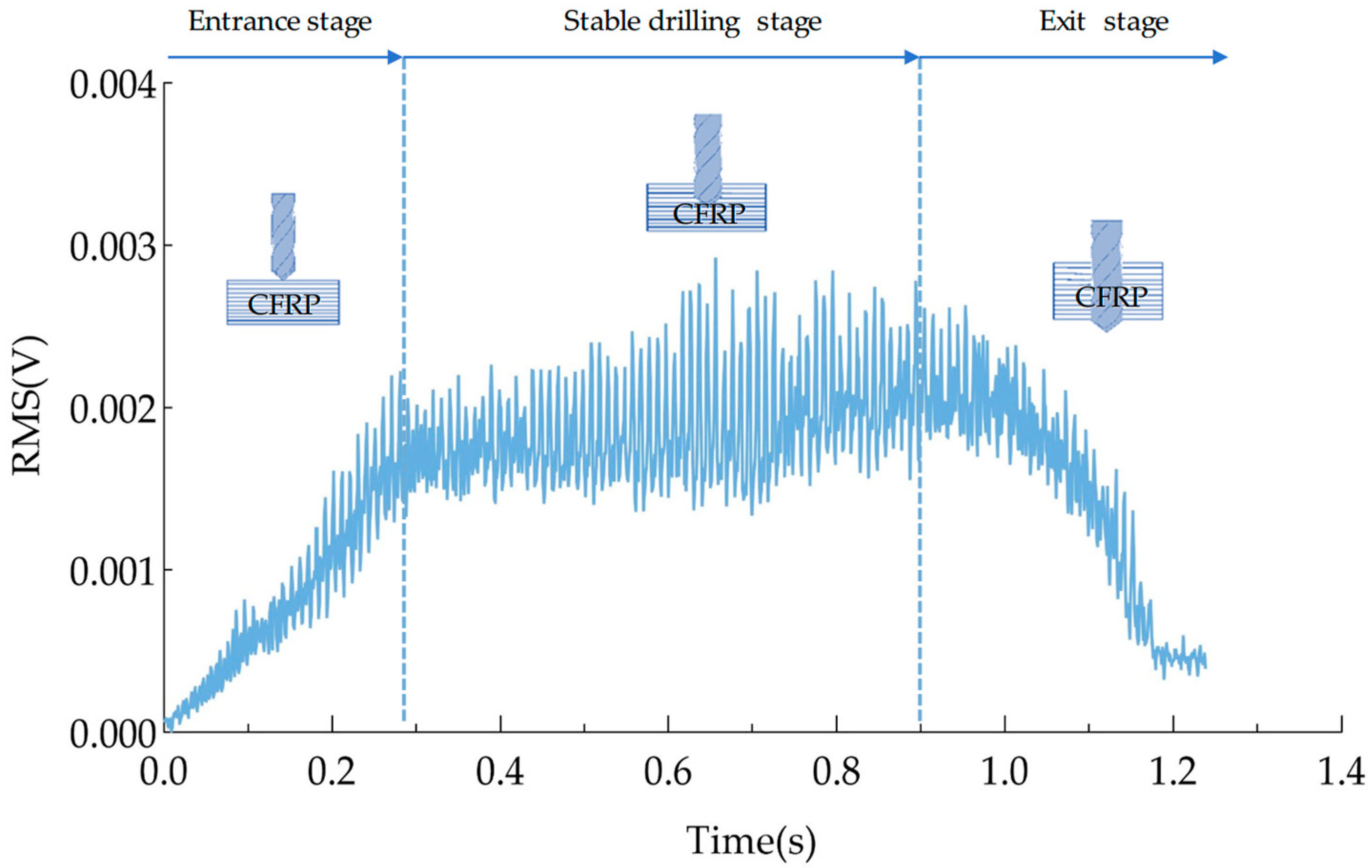 - The drilling process can be categorized into three distinct stages based on variations in the RMS of AE signals. Notably, a marked rise and fall in RMS values occur during the entrance and exit stages of drilling.