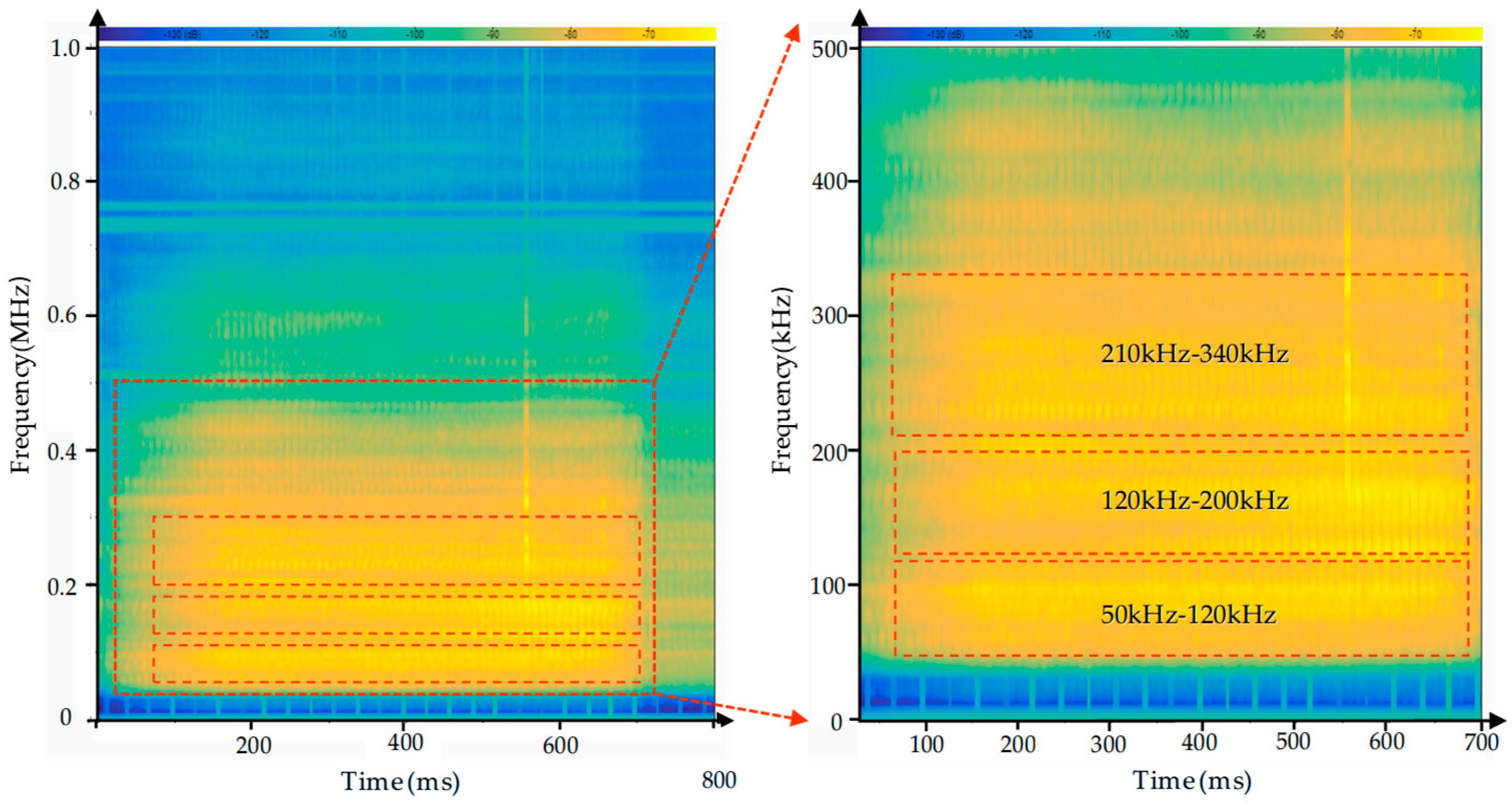 - The frequency features of AE signals associated with various damage types remain relatively stable regardless of machining parameters. These frequency domain characteristics can thus serve as indicators for identifying damage mechanisms during CFRP drilling. Specifically, collective cracking is associated with frequencies ranging from 60 to 120 kHz, delamination occurs within 120 to 200 kHz, and fiber fracture appears in the range of 210 to 340 kHz.