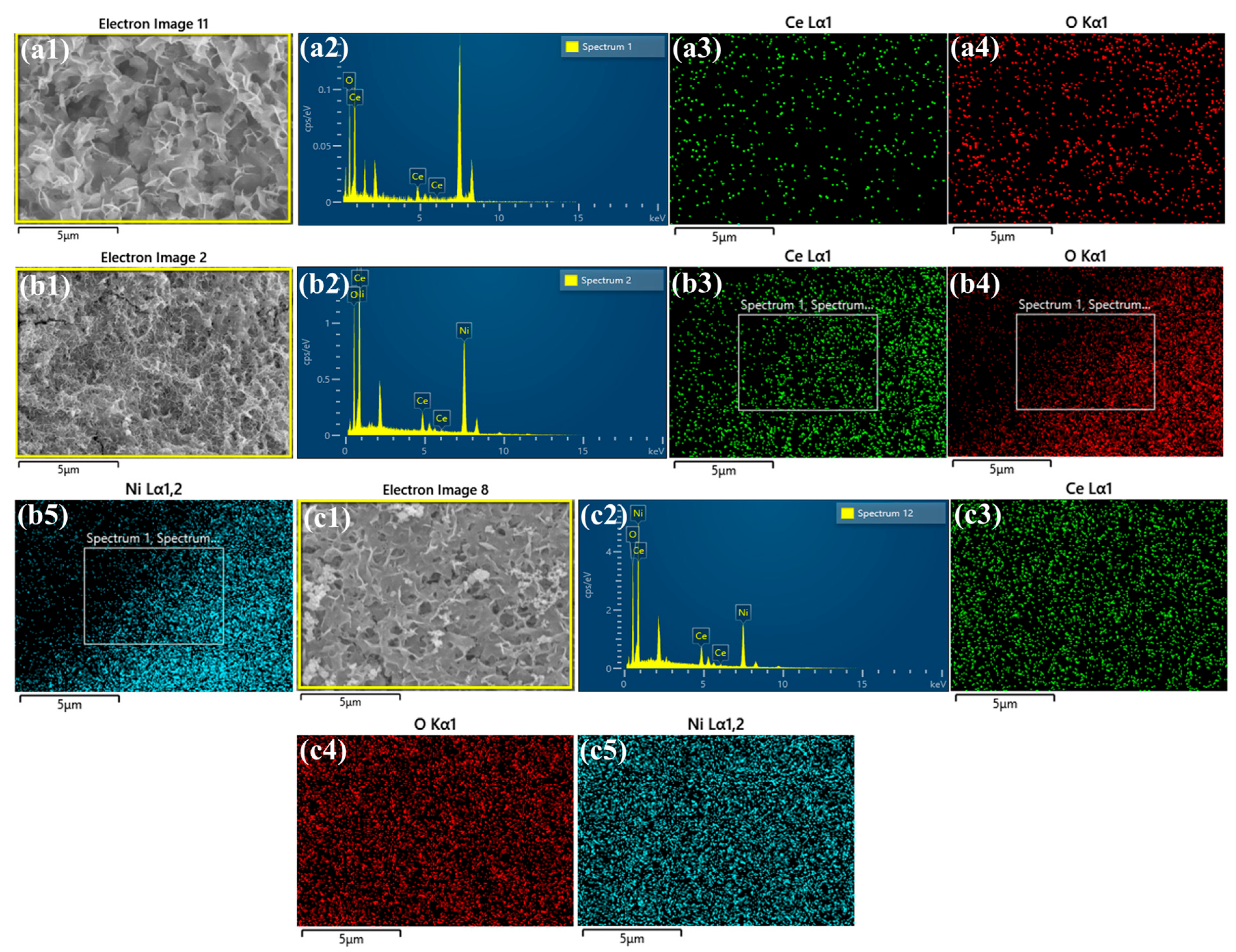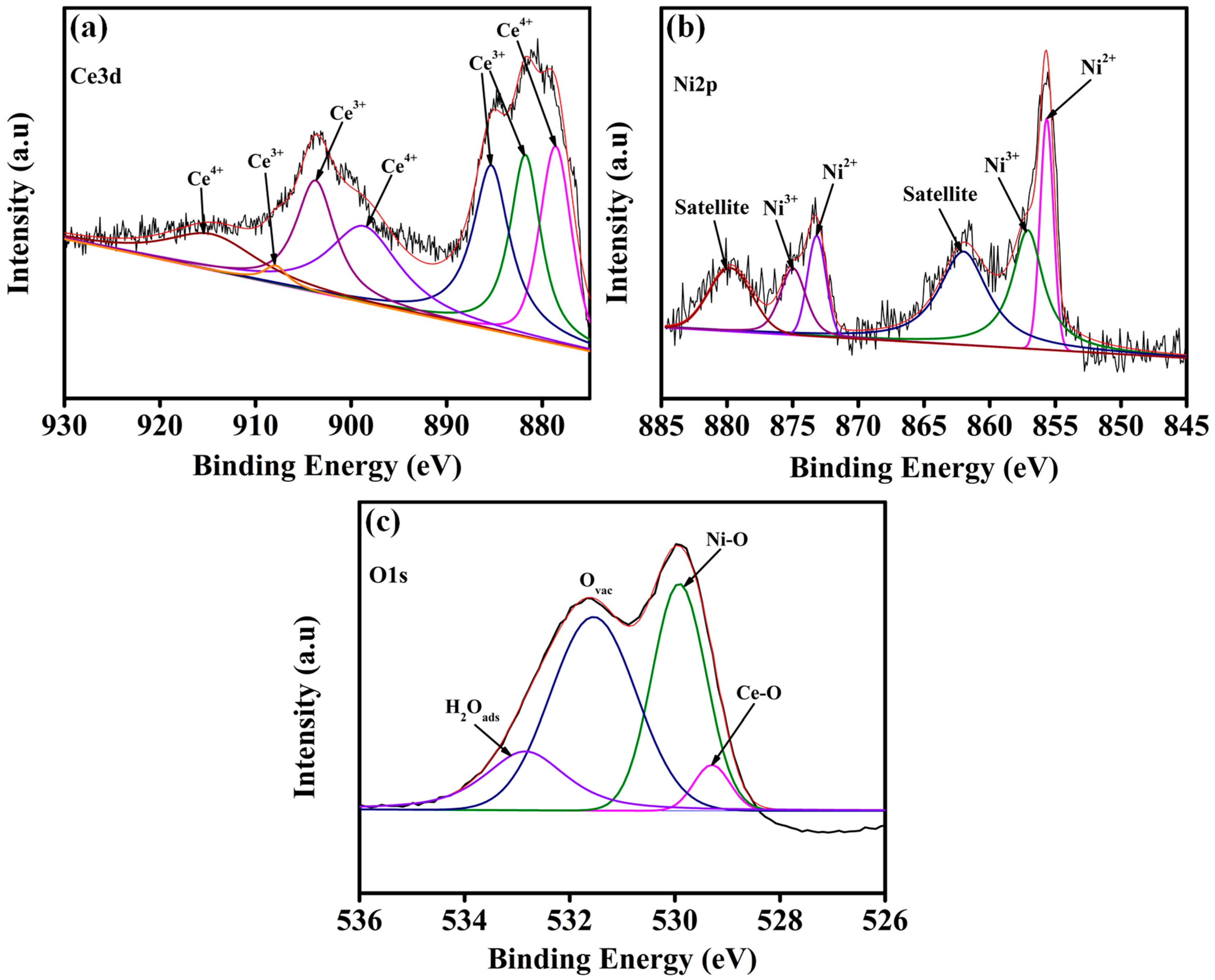 - Ghosh, D.; Manikanta Kumar, M.; Raj, C.R.; Pradhan, D. Bifunctional catalytic activity of solvothermally synthesized CeO2 nanosphere/NiO nanoflake nanocomposites. ACS Appl. Energy Mater. 2022, 5, 5666–5679. [Google Scholar] [CrossRef]