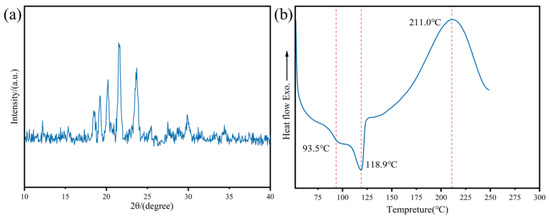 (a) XRD curve of HBAP-EP and (b) DSC curve of HBAP-EP at increasing temperature.