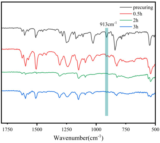 According to the infrared spectrum depicted in Figure 2, the presence of the characteristic peaks for the epoxy group (919 cm−1) and ether bond (1025 cm−1), coupled with the absence of the characteristic peak for the phenolic hydroxyl group (3264 cm−1), can preliminarily indicate the successful synthesis of the epoxy monomer [29,30].