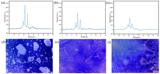 XRD curves of HBAP-EP/SAA cured resin at (a) 120 °C, (b) 140 °C, and (c) 160 °C, and the corresponding POM images directly underneath at (d) 120 °C, (e) 140 °C, and (f) 160 °C.