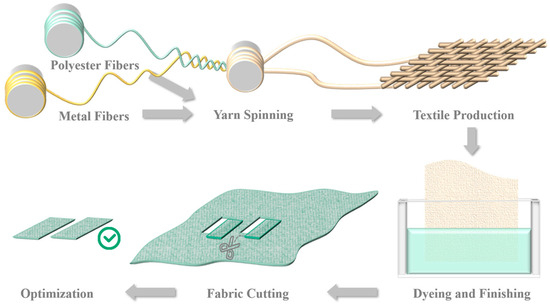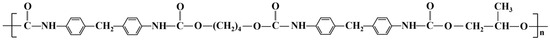 As shown in Figure 1, polyester fibers and stainless-steel metallic fibers were blended and processed through carding and drawing to form yarn. The yarn underwent sizing and warping to produce plain-weave textiles. The textiles were from the supplier Taizhou Huarun Textile Co., Ltd. (Taizhou, China). This fabric was then dyed at high temperature and pressure, followed by the application of a polyurethane coating solution to its surface, producing a polyurethane-coated fabric. The coating was from China North Industries Group Corporation Limited (NORINCO) Institute 53 (Jinan, China). The repeat structure of the polyurethane is shown in Figure 2.
