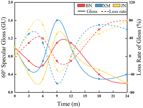 Figure 4 illustrates 60° specular gloss variation of fabrics during natural aging across three sites. Gloss displayed an initial decrease, followed by an increase and eventual reduction, with peak values consistently occurring at 9 months. This parameter is governed principally by intrinsic fiber luster, fabric architecture, and finishing methodologies [30]. In the early stage of aging, enhanced surface flatness due to rainfall impact and particle abrasion, combined with progressive resin coating curing, reduced diffuse reflection and increased gloss. Prolonged exposure caused coating degradation, thickness reduction, and roughness escalation, ultimately leading to fiber exposure and gloss attenuation [11,31]. After 24 months, the gloss retention rates were 20%, 40%, and 20% for BN, XM, and JN, respectively.