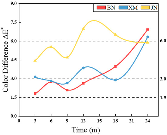 Divergent environmental conditions resulted in site-dependent aging mechanisms and severities. According to GB/T 1766-2008 Paints and varnishes—Rating schemes of degradation of coats, as detailed in Table 2, after 24 months of aging, fabrics exposed to the most aggressive conditions in BN exhibited the maximum ΔE* of 6.93, corresponding to distinct color change [34]. Fabrics in XM demonstrated moderate ΔE* at 6.34, similarly graded as distinct color change. The fabrics in the JN region had the least color difference (5.89), rated as a slight color difference.