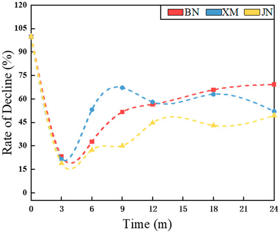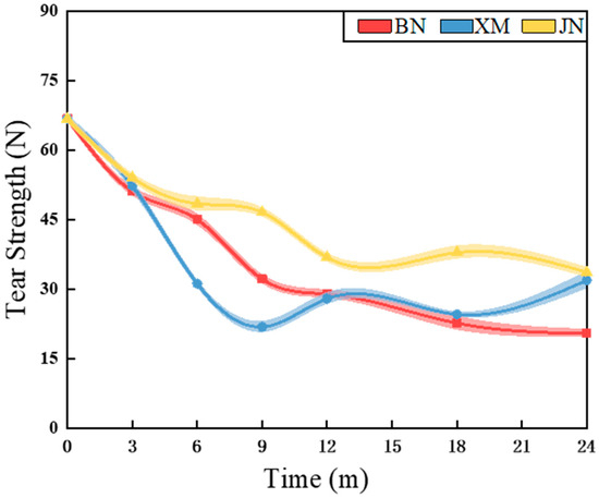 The tear strength profile of fabrics during natural aging is shown in Figure 6 and Figure 7. Fabric mechanical properties demonstrated an overall declining trend with natural aging duration, characterized by an initial rapid decline followed by a gradual decrease. In BN and XM, characterized by higher temperatures and stronger irradiation, tear strength decreased substantially within 9 months, while the fabric in JN exhibited accelerated reduction within 12 months. Coating technology served as a key enhancer of fabric mechanical performance [35]. During the early aging stages, coating oxidation and hydrolysis induced thinning and delamination, thereby causing rapid deterioration. As aging time increased, the subsequent deceleration of tear strength loss potentially stemmed from the temperature fluctuations and moisture ingress in natural environments, which promote molecular chain mobility and facilitate polymer chain reorganization and crosslinking [36]. Thus, this process alleviates internal stresses and defects and simultaneously enhances coating rigidity and improves fiber stress distribution uniformity [37]. Mechanical property retention rates reached 48% in BN after 9-month aging, 47% in XM following 6 months, and 50% in JN after 24-month exposure.
