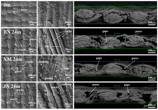 In BN, extreme humidity and heat combined with intense irradiation synergistically drive continuous uniform degradation of polyurethane coatings. Coupled photothermal oxidative chain scission and hydrolysis cause severe delamination. This manifests as drastic deterioration with gloss at 0.2, an 80% decrease; color difference at 6.93; and severe deterioration of mechanical properties with a retention rate of only 31%. In XM, the penetration of Cl− ions in salt spray induces electrochemical corrosion, which accelerates surface chalking and erosion of the coating, thus causing a sharp decline in optical and mechanical performance. Gloss is 0.4, a decrease of 60%; color difference is 6.34; and the mechanical property retention rate is 48%. In JN, thermomechanical fatigue from thermal cycling propagates interfacial microcracks, yet overall structural integrity remains comparatively preserved. After aging, measurements show an 80% gloss decrease to 0.2, a color difference ΔE* of 5.89, and a 50% mechanical retention. Multifactorial degradation ultimately destabilizes coating/substrate interfaces, causing discoloration, fiber damage, and mechanical decline.