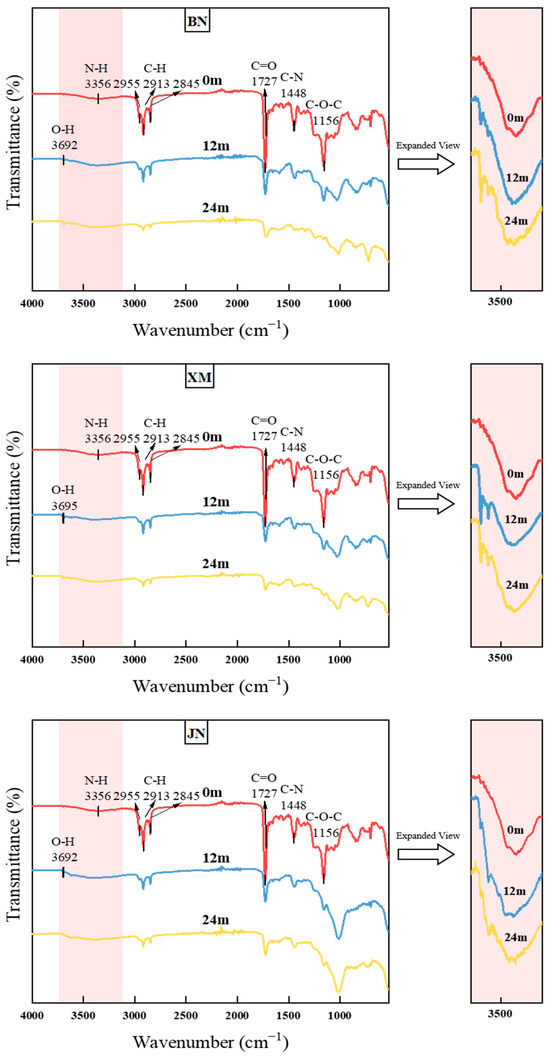 With progressive aging in BN, transmittance of C=O at 1727 cm−1 increased to 83.08%, which indicated the most severe carbonyl degradation. Concurrently, the 1156 cm−1 transmittance rose to 81.63%, suggesting C-O-C accelerated cleavage. This likely attributed to synergistic oxidation and hydrolysis under high-temperature and intense irradiation. C=O transmittance of samples in XM reached 85.53% at 1726 cm−1, reflecting C=O observable degradation. The transmittance of the C–O–C peak at 1156 cm−1 increased to 81.15%, confirming the bond cleavage. Due to the coupled effects of high humidity, precipitation, and salt spray, intense hydrolysis of –NHCOO– and C–O–C bonds occurred. The transmittance of samples from JN increased to 79.16% at 1727 cm−1 and to 71.50% at 1156 cm−1, which shows a relatively small increase, pointing to a less severe degree of degradation. Notably, hydrogen bond peaks near 3618 cm−1 intensified in both BN and XM, reflecting enhanced hydrogen bonding during hydrolysis.
