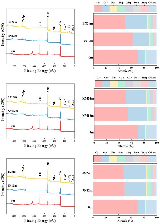 Figure 10 presents XPS spectra and elemental changes of naturally aged fabrics. After natural aging, the C1s peak intensity decreased, accompanied by a slight leftward shift in binding energy. The O1s peak intensity increased. The Al2p, Zn2p, and Pb4f characteristic peaks appeared, and their intensities continued to increase with aging. Meanwhile, carbon content markedly decreased, whereas oxygen content substantially increased. These findings indicate that oxidation of C–C/C–H bonds reduces electron density around these bonds, leading to higher binding energies. As a result, the coating oxidation continuously deepened. Moisture ingress caused coating delamination, decomposition, shedding, and fiber exposure. In addition, metal elements like Al, Zn, and Pb from pigments gradually emerged, and their content correlated positively with aging time [45,53,54].