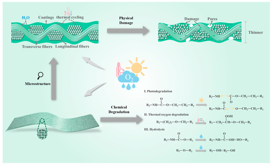Figure 11 illustrates aging mechanisms of polyurethane-coated fabrics under combined temperature, humidity, irradiation, chemical media. The damage mechanism can be divided into two processes: physical damage arises from thermal stress and moisture intrusion, and chemical degradation caused by photo–oxygen–water coupling.