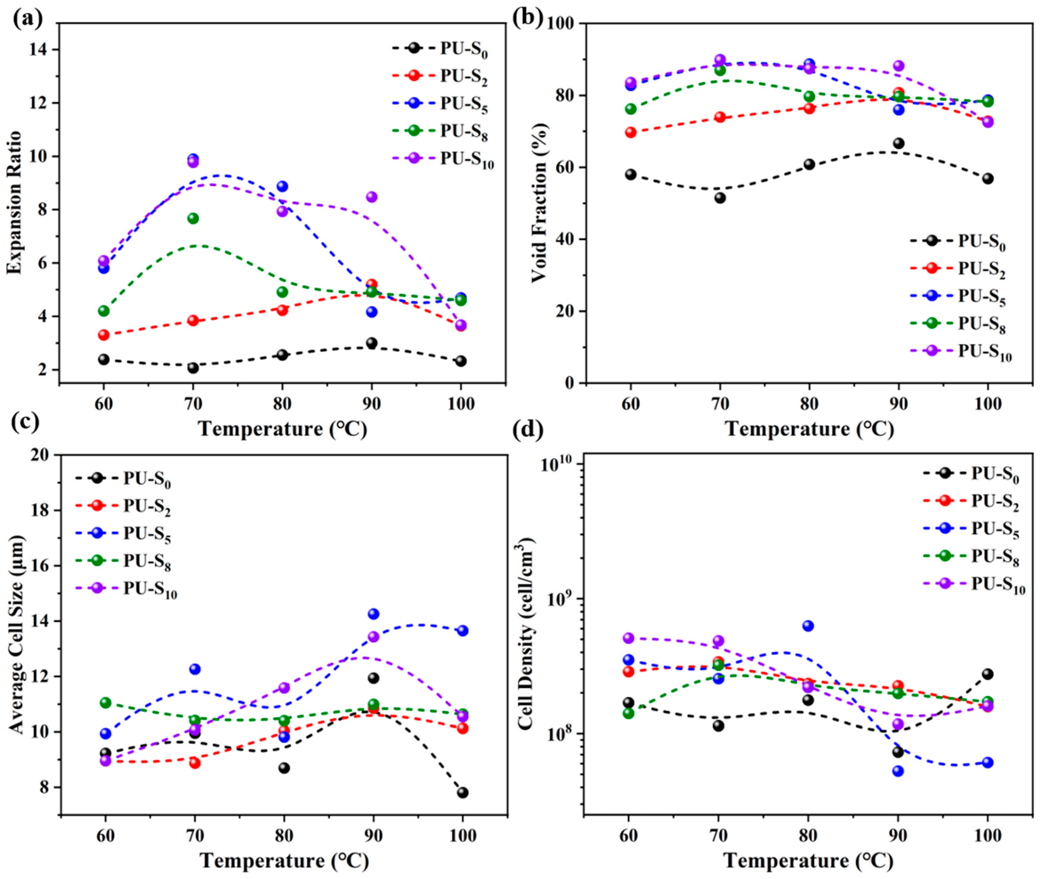 - Zhong, W.; Zhou, X.; Zhang, M.; Cui, W.; Mi, H.Y.; Dong, B.; Liu, C.; Shen, C. Wrinkled thermoplastic polyamide elastomer foams with enhanced mechanical properties fabricated by dynamic supercritical CO2 foaming. Polym. Eng. Sci. 2025, 65, 834–845. [Google Scholar] [CrossRef]