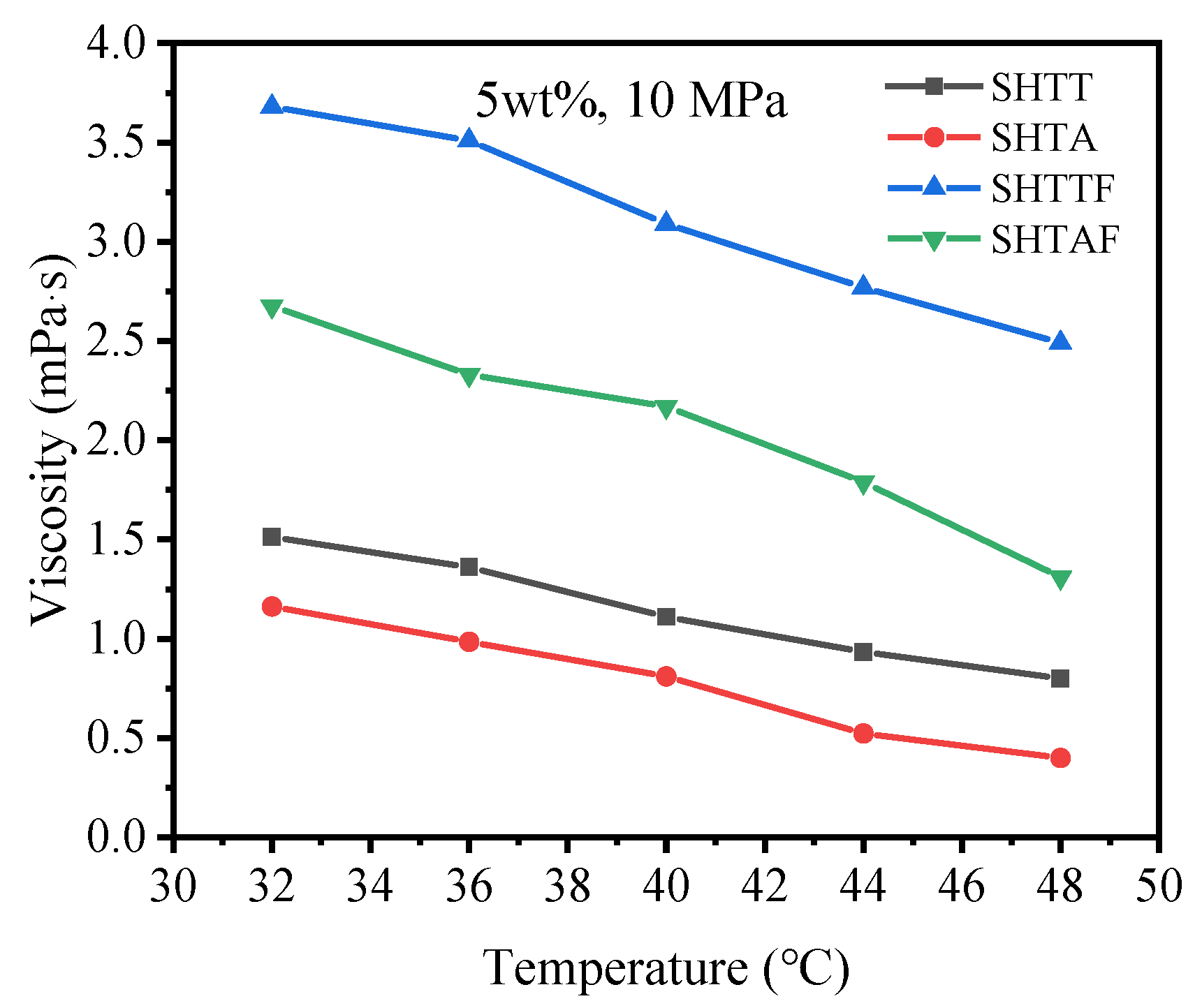 - The fluorinated silicone thickeners demonstrated exceptional thickening performance and favorable solubility. At 5 wt% concentration under 10 MPa and 32 °C, they formed homogeneous mixtures with CO2, elevating the viscosity of CO2 to 3.68 mPa·s. Systematic experiments established positive correlations between CO2 viscosity and both thickener concentration and pressure, while revealing an inverse relationship with temperature. The limitation of this study is that it only investigated the thickener concentrations within the range of 0~5 wt%.