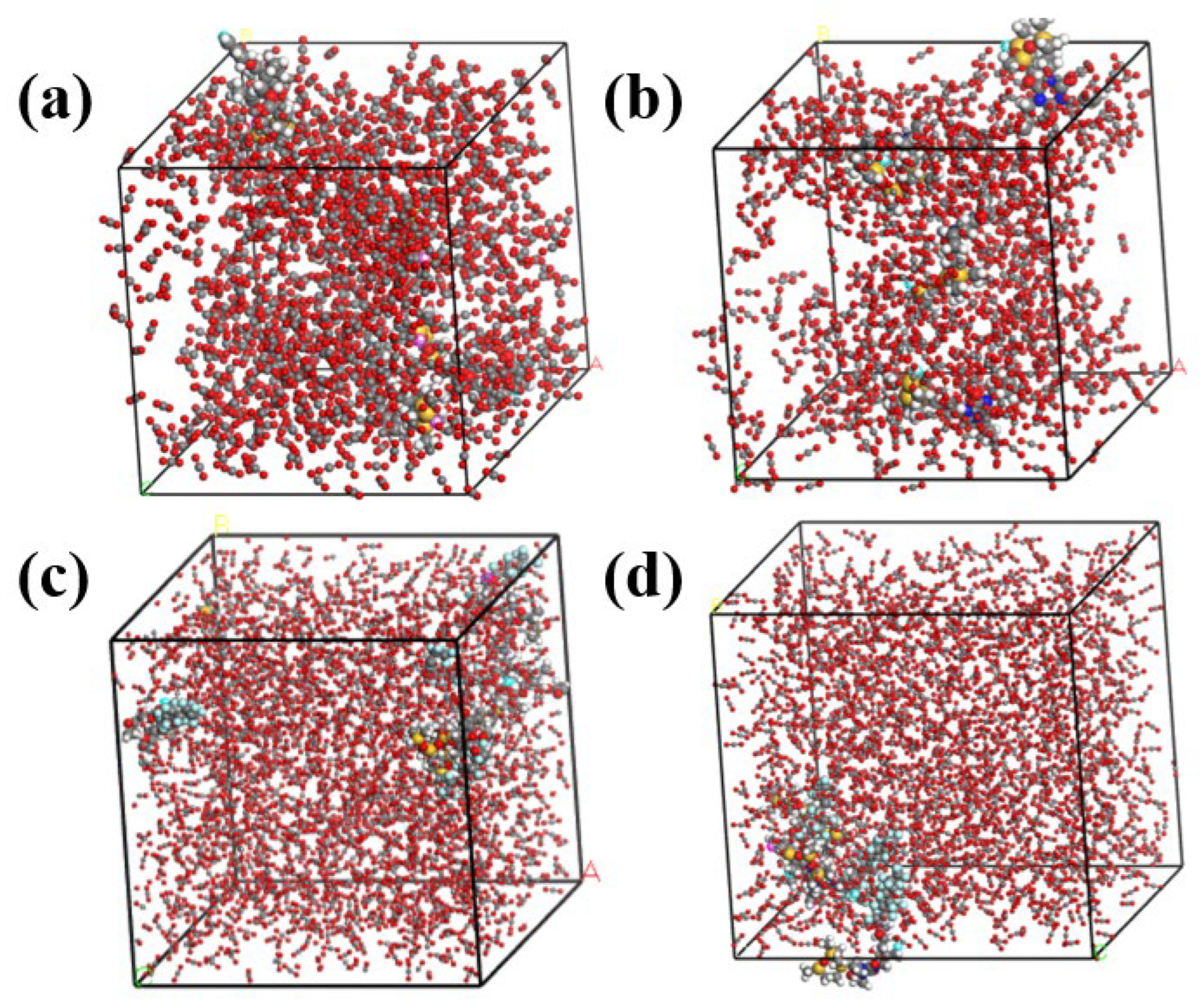 - Under the NPT ensemble, the desired temperature and pressure conditions (305.15 K, 10 MPa) were set. The Andersen thermostat and Berendsen barostat were employed, respectively. The time step was set to 1 fs, and the total simulation duration was 500 ps. In the aforementioned molecular dynamics process, one frame was output every 5 ps, and the data from the last 100 ps were used for subsequent data analysis.