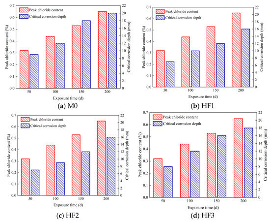 | Mixture | Exposure Time (d) | Peak Chloride Content (%) | Critical Corrosion Depth (mm) |