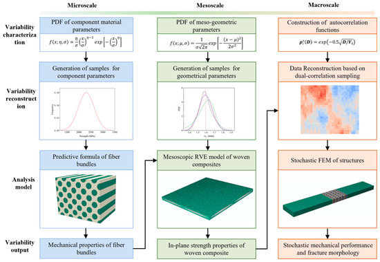 The uncertainty analysis of in-plane tensile mechanical properties and damage behaviors in plain woven composites should be performed first. The reinforcement of composites was composed of T300 carbon fibers impregnated with EH301 epoxy resin. Figure 1 illustrates the multiscale uncertainty analysis, including uncertainty propagation from the microscale to the macroscale. The procedure comprises the following key steps: