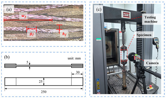 Optical microscopic morphology and mechanical testing for plain woven composites: (a) mesoscopic cross-sectional morphology; (b) schematic diagram of dimensions for tensile specimens; (c) on-site diagram of tensile test.