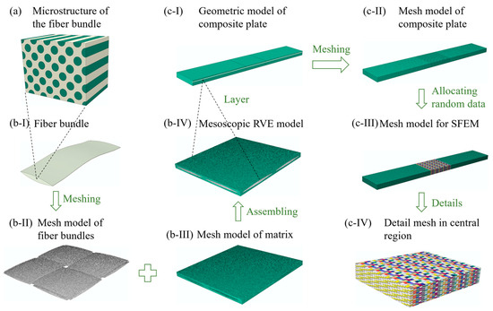 The multiscale modeling process for plain woven composites was depicted in Figure 3. Figure 3a shows the microstructure of a fiber bundle, wherein the fiber filaments are assumed to be uniformly distributed (Figure 3b-I) with a well-bonded interface with the matrix. At the mesoscale, plain woven composites consist of orthogonally woven fiber bundles (Figure 3b-II) and the complementary matrix (Figure 3b-III). Considering the periodic features of mesoscopic morphologies, the RVE model (Figure 3b-IV), divided by tetrahedral elements, was utilized to predict the mechanical properties of composites. At the macroscale, tensile specimens were constructed by stacking multiple layers of woven composites at specified ply angles (Figure 3c-I). Consequently, the geometrical model was meshed using regular hexahedral elements, with each layer being divided into a single layer of elements (Figure 3c-II). The central region was refined to assign randomly generated material parameters (Figure 3c-IV). Ultimately, the SFEM (Figure 3c-III) was established to calculate the mechanical response and failure morphology of the laminate structure.