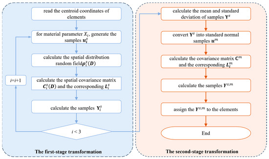The detailed dual correlation sampling process is depicted in Figure 4. Firstly, a spatial autocorrelation function is constructed to convert standard normally distributed random samples into spatially autocorrelated samples along the spatial dimension. Then, based on the principle of equal probability [37], the samples are further converted into cross-correlated material data in material dimensions. The specific process of dual-correlation sampling is delineated as follows: