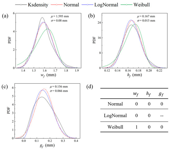 At the mesoscale, the randomness of three meso-geometric parameters was considered, and hypothesis testing methods [40] were employed to determine their probability distribution functions (PDFs). The PDFs based on Kernel density estimation [41] for the data gathered using an optical microscope are plotted in Figure 5. It can be observed that the coefficients of variation for and are within 10%, whereas, attributed to nesting and dislocation phenomena [42] during the preparation process, the gap of fiber bundles exhibits notable dispersion. Three statistical distribution functions were selected for hypothesis testing on the acquired data: normal distribution, lognormal distribution, and Weibull distribution. Specifically, normal distribution was assessed using the Lilliefors test due to its high calibration efficiency, while lognormal distribution and Weibull distribution were evaluated using the highly versatile Anderson-Darling test [43]. At the significance level of 0.05, the hypothesis testing results are summarized in Figure 6d, where 0 and 1 indicate acceptance and rejection of the hypothesis, respectively. Notably, the lognormal distribution function is not applicable for testing the data of due to the negative portion of the PDFs.