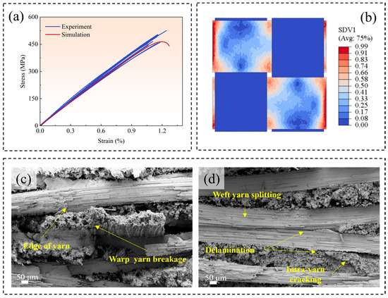 A comparison of the stress–strain curves and damage morphologies obtained from the RVE model and the experiment: (a) a comparison of the stress–strain curves obtained from the experiment and the RVE model; (b) the damage contour pattern of the warped fiber bundle predicted by simulation, showing that fractures occur in the intersection area of fiber bundles; (c,d) the fracture morphologies of composites observed by SEM, showing that the breakage of warp fibers bundles occurs in the edge regions of weft fiber bundles.