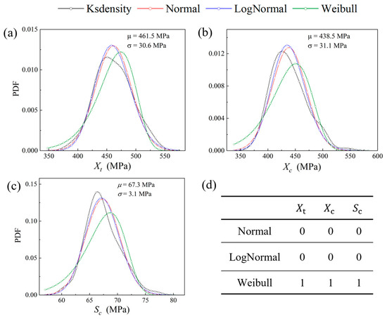 Probability distribution and curve fitting of in-plane strength parameters of plain woven composites: (a) tension strength ; (b) compression strength ; (c) shear strength Sc; (d) results of hypothesis testing. Acceptance: 0 and rejection: 1.