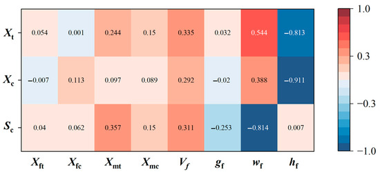 Finally, Figure 8 presents the sensitivity analysis results of material strengths to random input factors to reveal the underlying mechanisms of the statistical correlation using the Pearson method. Compared to the random factors of constituent materials, the strength properties are more sensitive to variations in mesoscopic geometric morphologies. Specifically, and are jointly influenced by the and of fiber bundles with similar trends, thereby exhibiting significant positive correlation. However, the parameter Sc is related to the fiber volume fraction and matrix properties except , resulting in weak correlation with the other two strength parameters. It is worth emphasizing that the sensitivity analysis results provide a valuable perspective on enhancing the mechanical properties of plain woven composites. Since the ratio of and exhibits the highest sensitivity to material properties, it can effectively reduce the fluctuation ratio of fiber bundles by increasing the compaction force during the prepreg preparation process or adopting thin-ply composites [44], thereby leading to a significant enhancement in the in-plane strength performance of the plain woven composites.